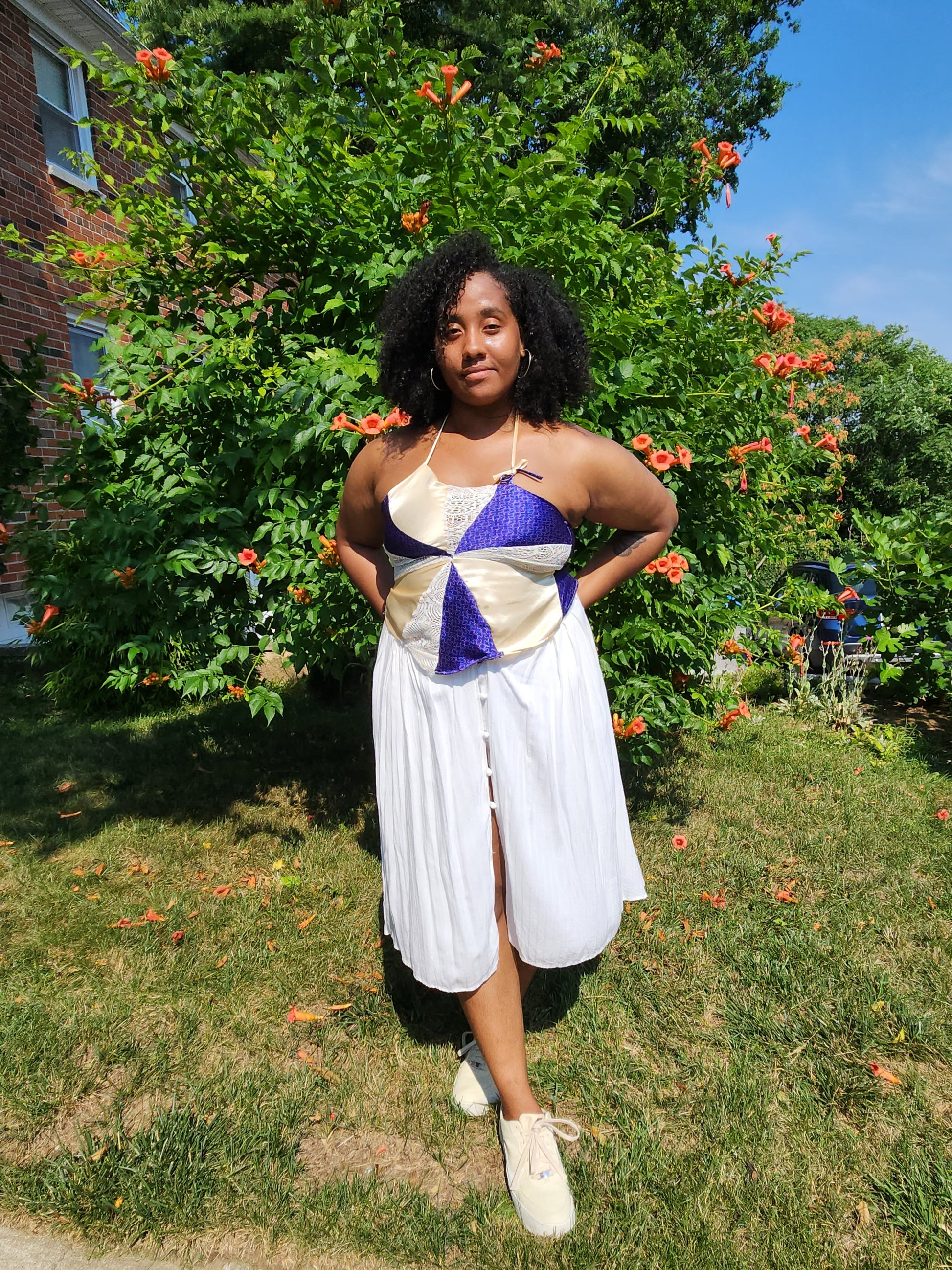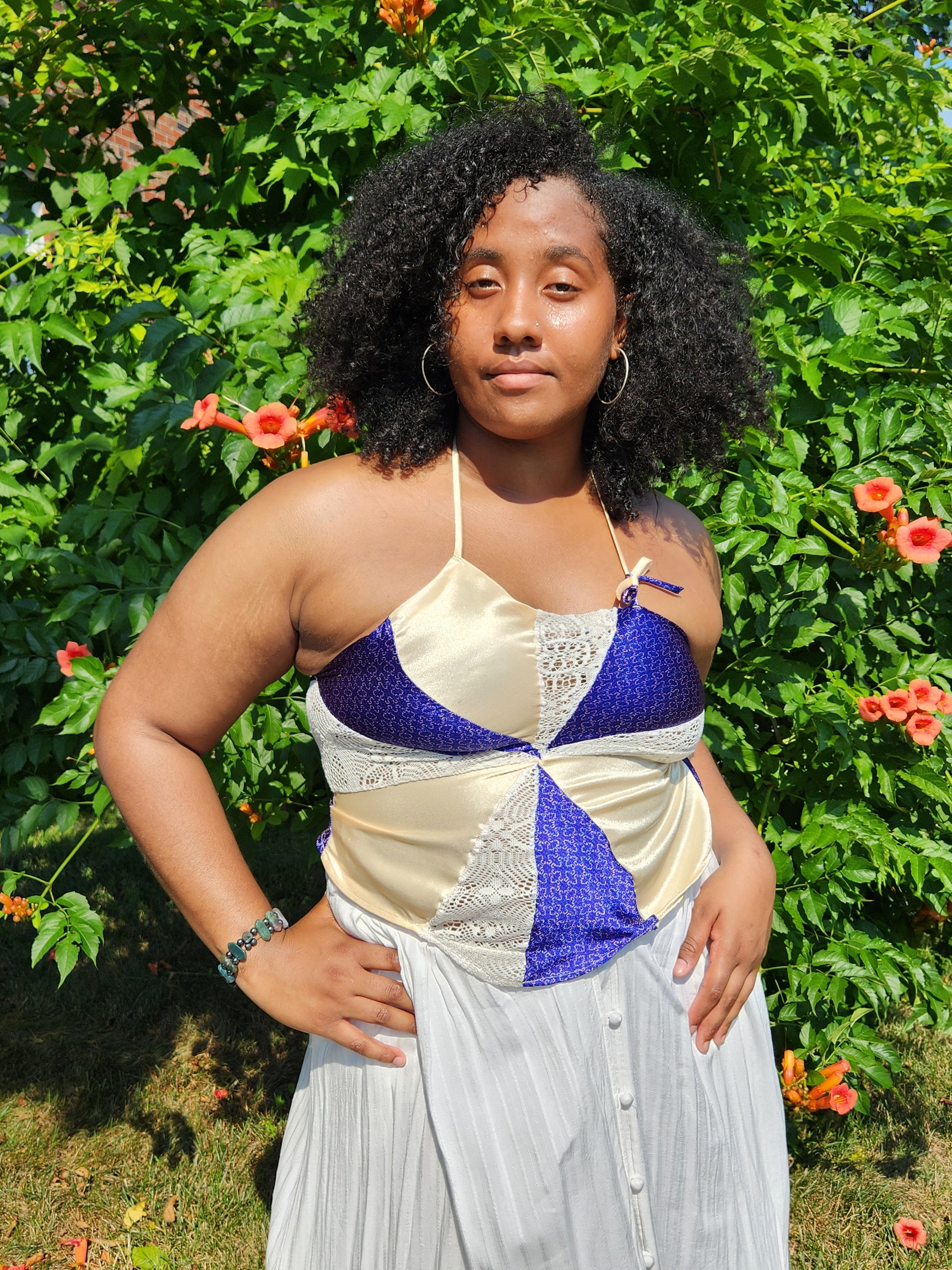 Asymmetrical halter top with colors honoring Oshun y Yemaya.