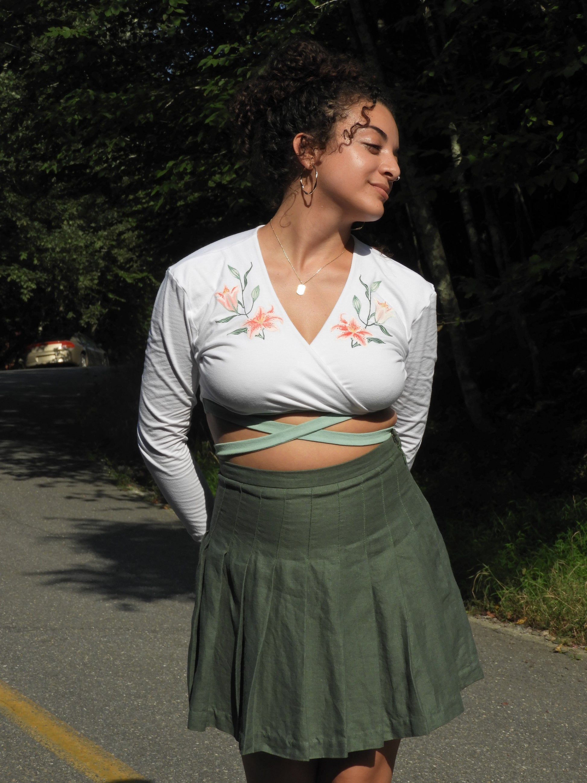 Hand painted lily motifs and hand dyed ties. Made of double layered fabric, so you're free to wear it with or without a bra.