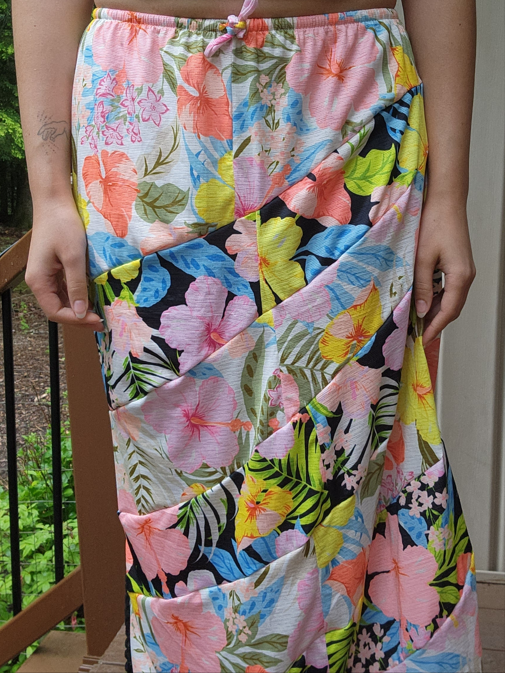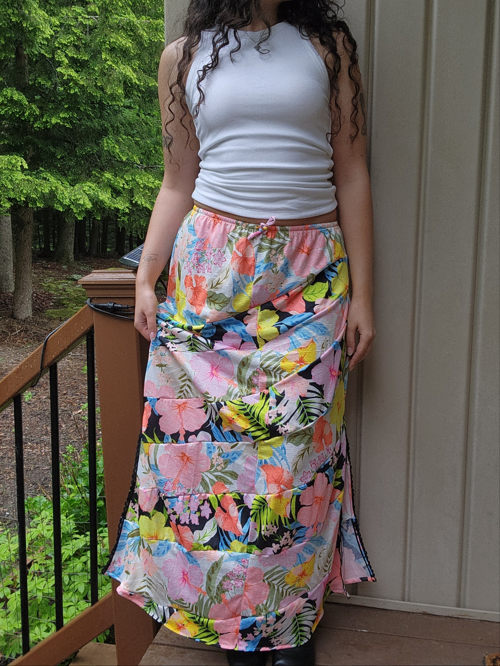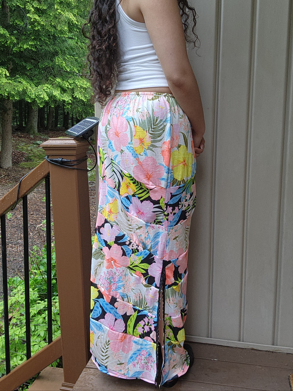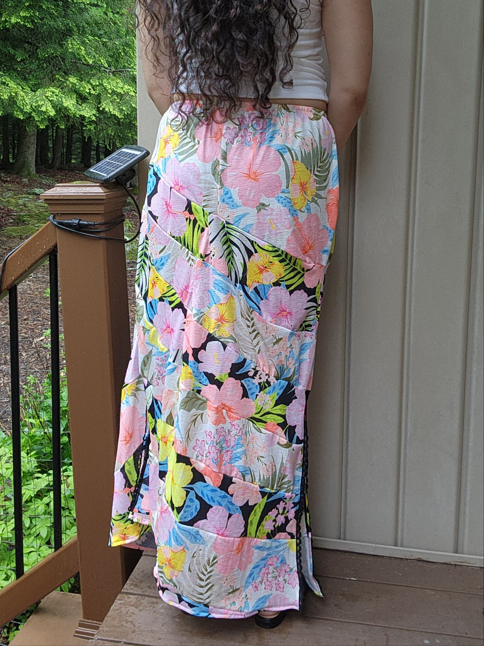 Add some whimsy to your outfit with the Patchwork Maxi. This patchwork skirt takes two beautiful fabrics and swirls them together to create one flowing piece.