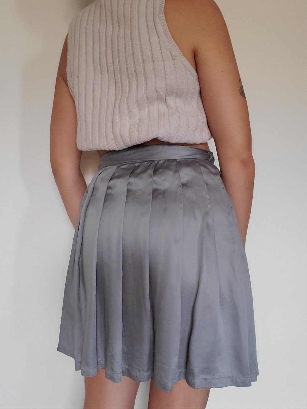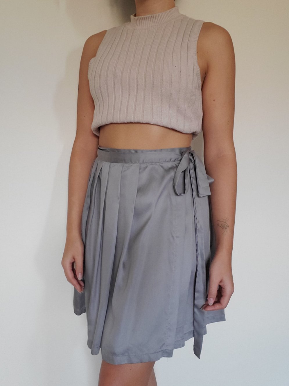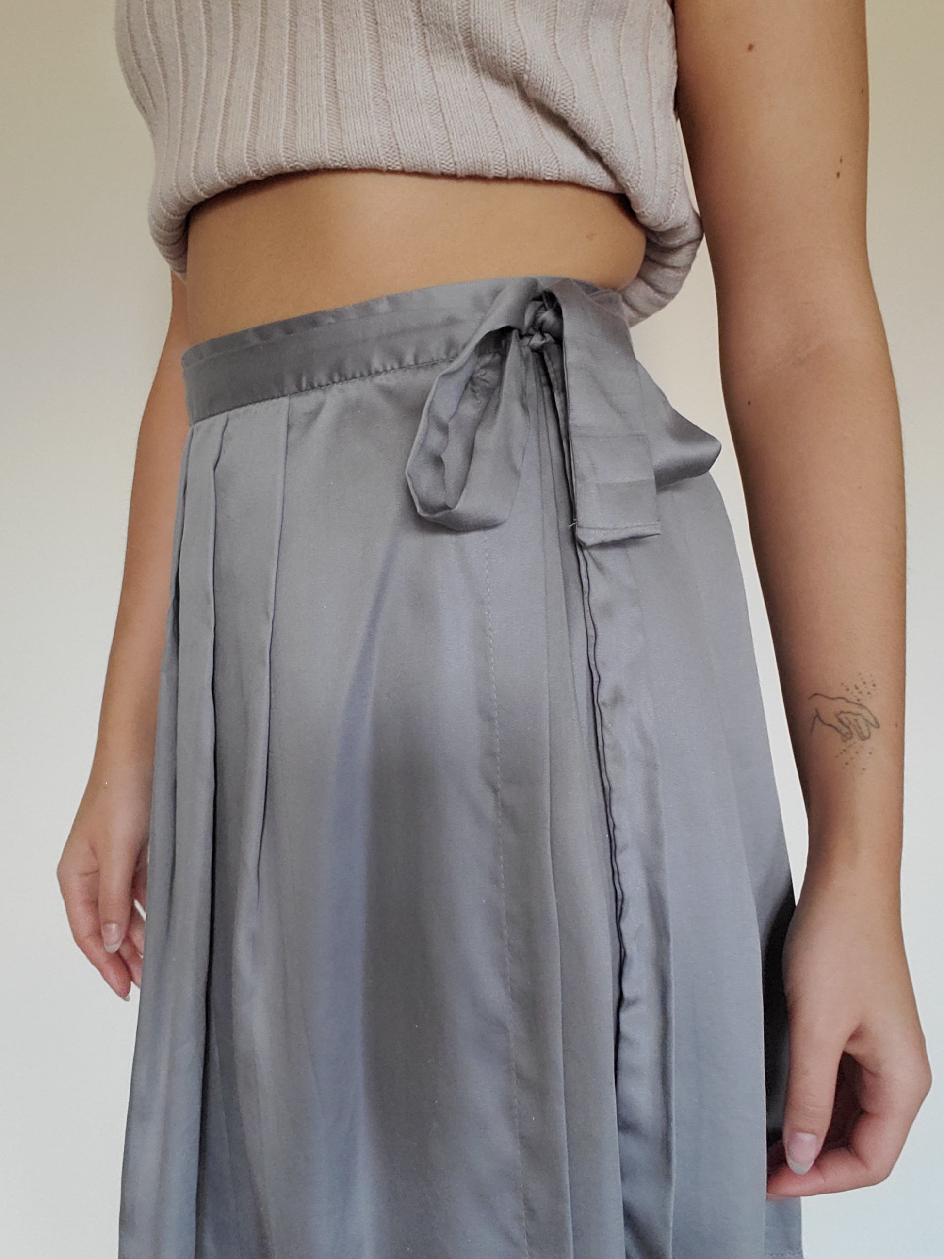 This skirt wraps around the body and ties on the side. Pleat widths vary depending on size.