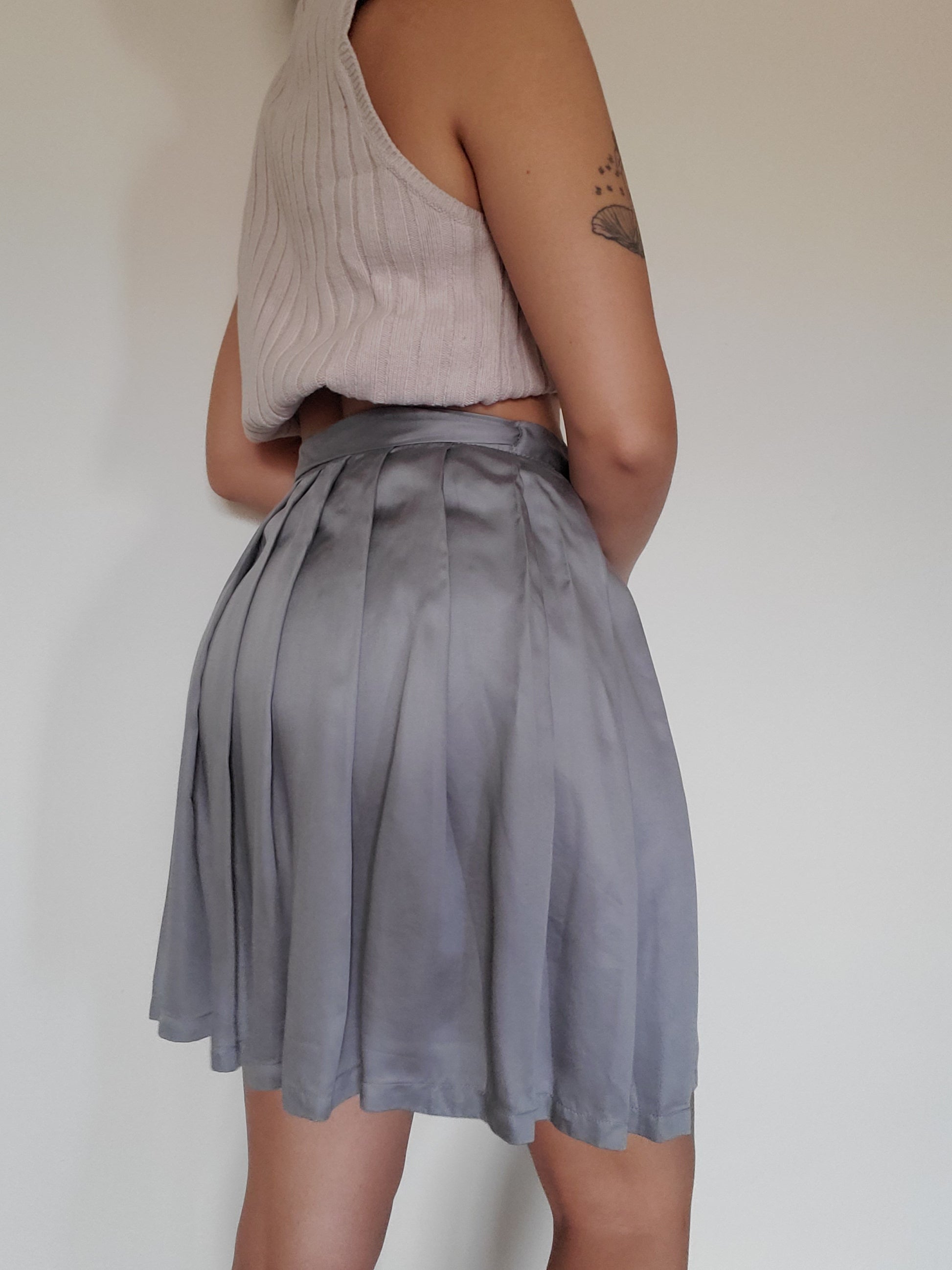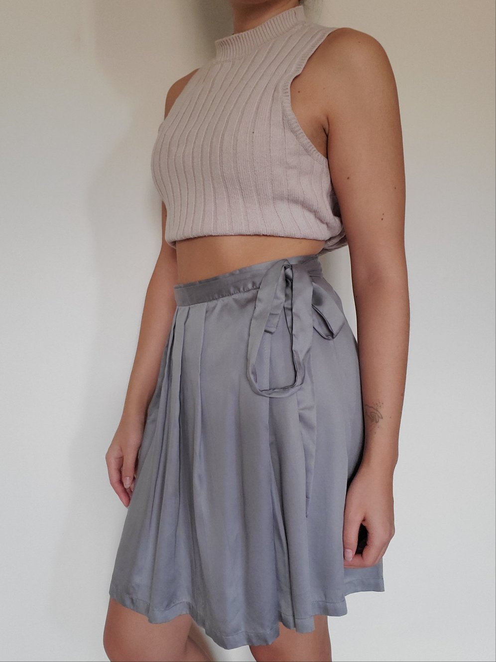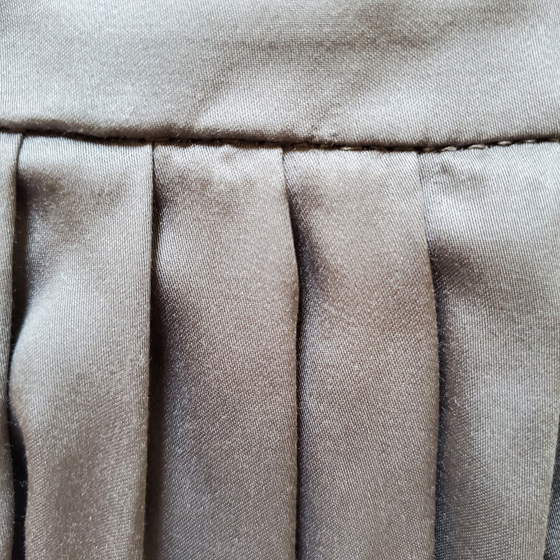 This skirt wraps around the body and ties on the side. Pleat widths vary depending on size.