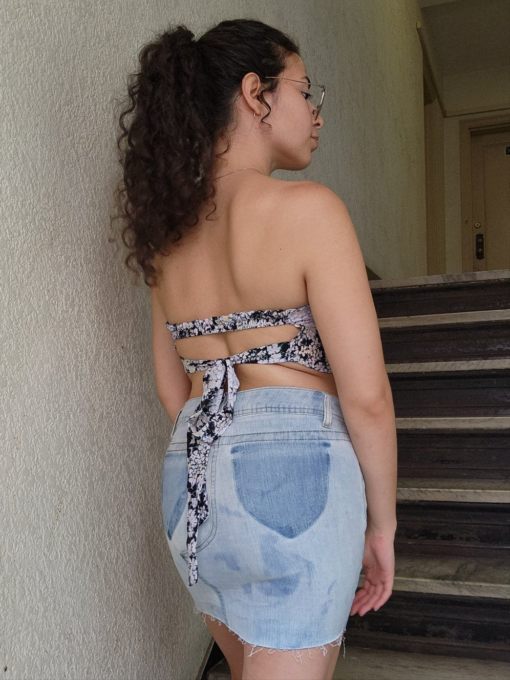 Distressed denim skirt made of recycled denim.
